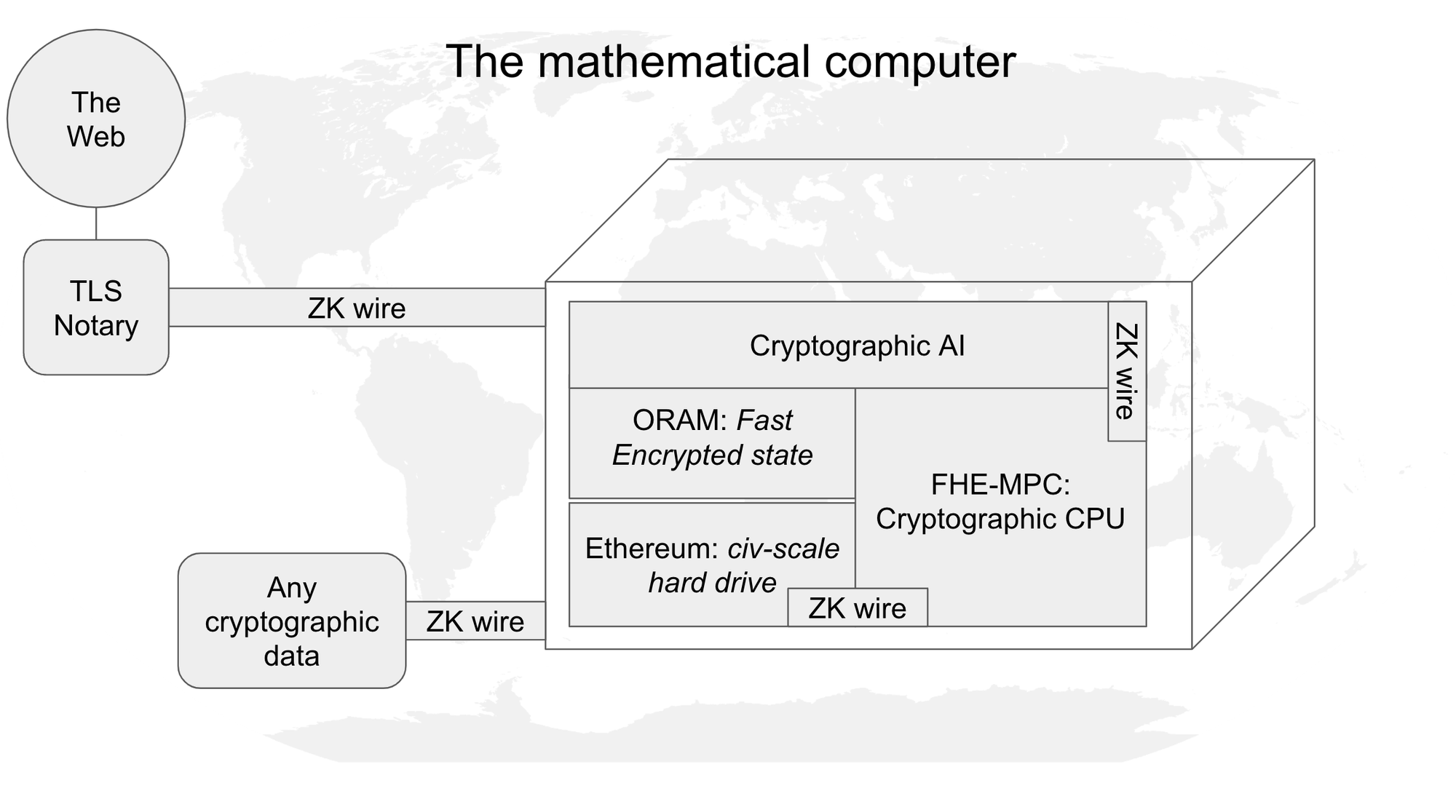 For example, realizing the vision of Hallucinated Servers would require us to have verifiable encrypted computation—SNARKs on top of FHE and MPC. Inputs into a cryptographic negotiation in this world would ingest Universal Protocol data, which relies on ZKPs. And in order to execute such operations statefully and performantly, we would likely need to integrate ORAM or similar technologies.