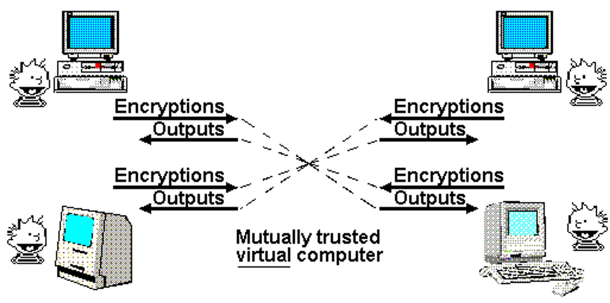 This idea is a bit further out from the idea of the Universal Protocol / Universal Adapter, but only by a few years. Work on early prototypes of computing networks based on both general-purpose multi-party computation technology and fully homomorphic encryption is underway today. Multi-party fully-homomorphic encryption is a promising candidate for a base technology for these networks; further down the line, techniques like program obfuscation could decrease the communication complexity and liveness requirements for such networks.