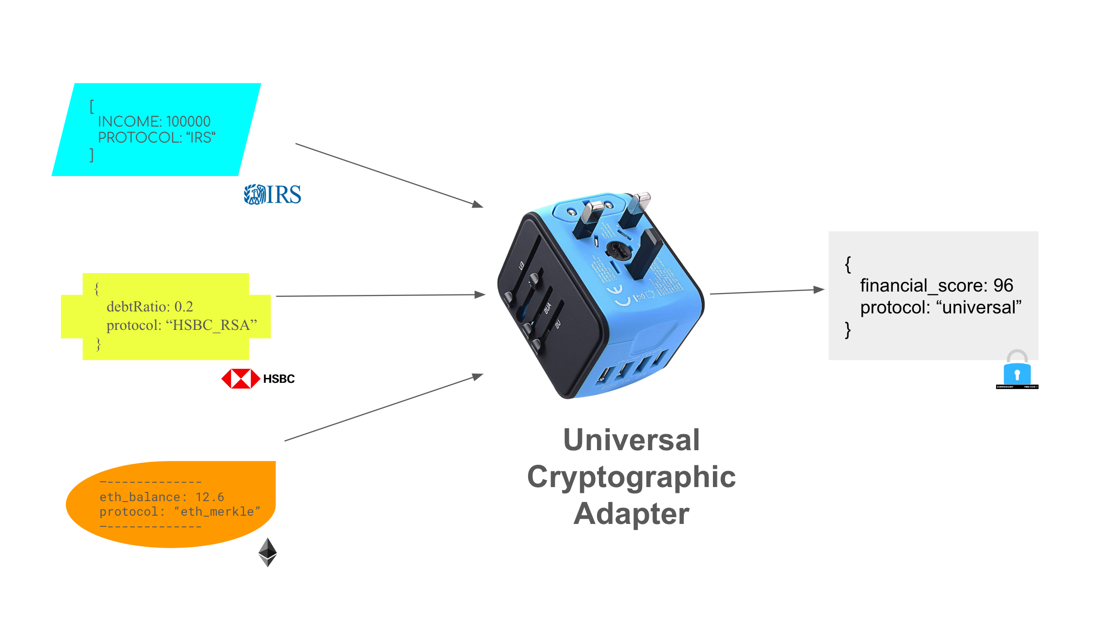 Universal Cryptographic Adapters, based on technologies like zkSNARKs, allow us to compose and transform data originating from any source cryptographic protocol/format to any destination.