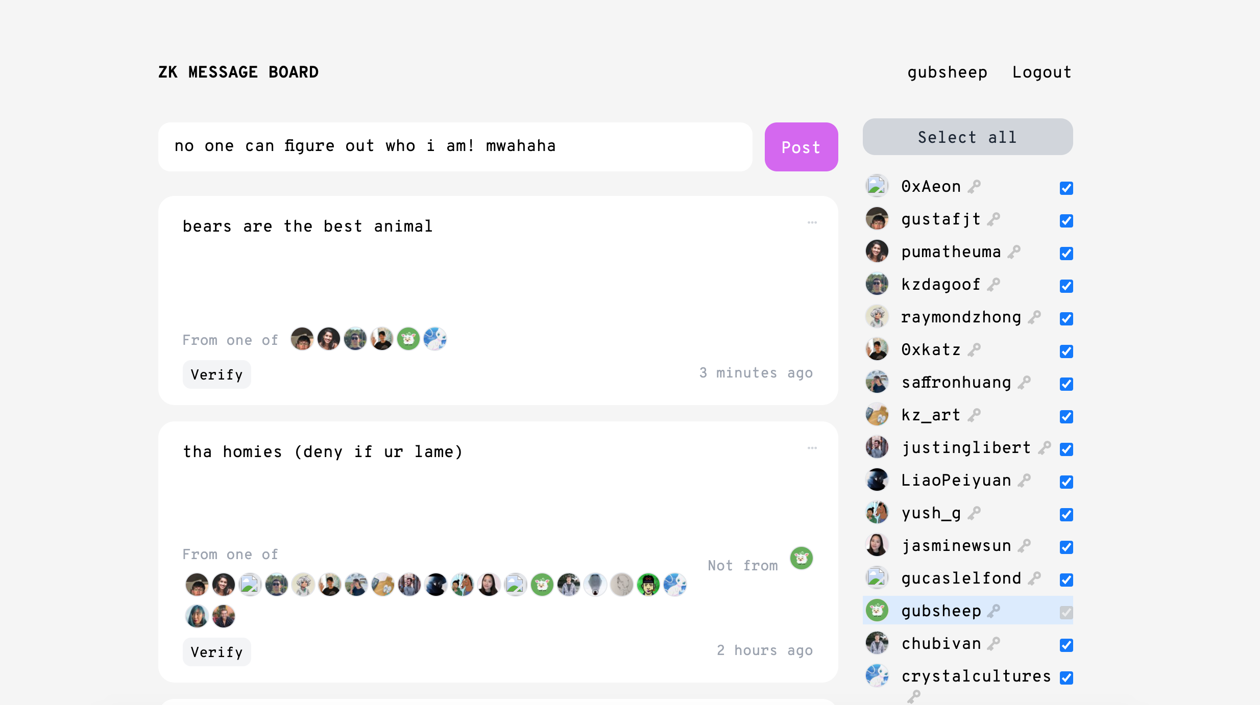Users first claim a ZKMessage public key by Tweeting an attestation to a freshly-generated keypair. When a user wishes to submit a post, they select up to 39 other users to form a group, generate a group signature ZK proof for their message client-side, and then send the message and signature to our server, which stores signed posts in a Postgres database. The webserver then serves these signed posts to users who wish to view the message board; users can verify signatures client-side, though they won’t be able to narrow down the original poster beyond the poster’s specified group.