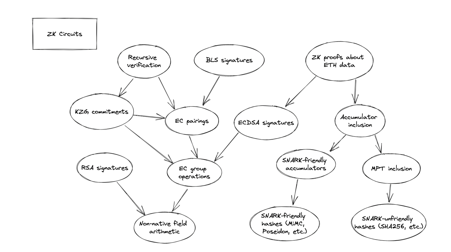 - Elliptic curve pairing: Pairing-friendly elliptic curves give us access to bilinear maps, enabling polynomial commitments, BLS aggregate signature verification, recursive SNARK verification, Verkle Trees, and more. Efficient implementations of ZK circuits for elliptic curve pairings will unlock a huge variety of new cryptographic operations.